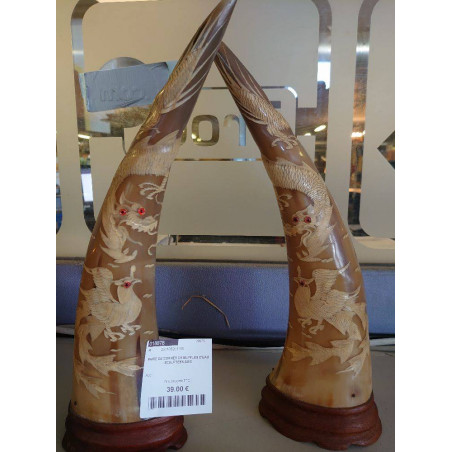 PAIRE DE CORNES DE BUFFLES D\'EAU SCULPTEES ASIE